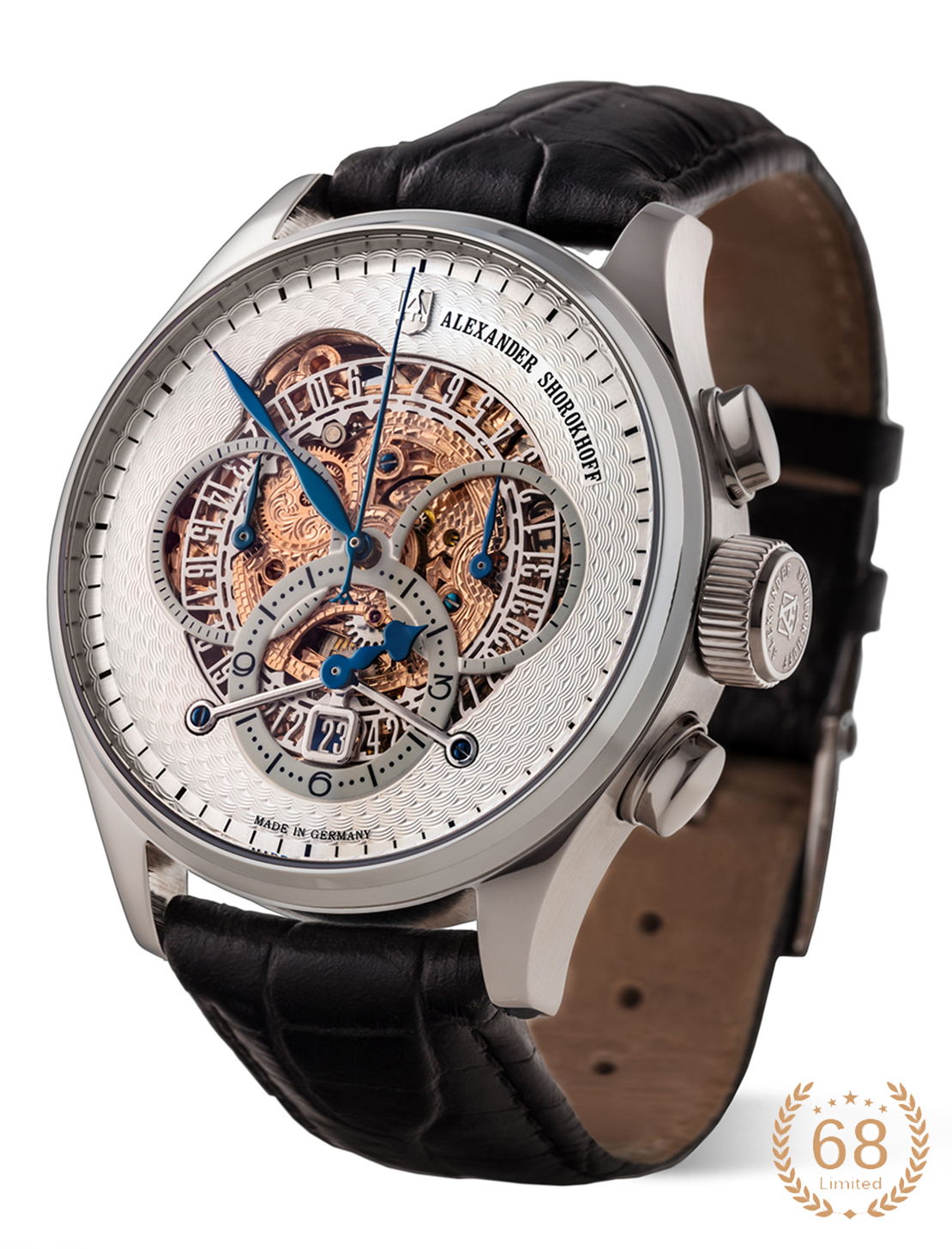 Another feature is the rhodium-plated and skeletonized date display disc. In order to see the date clearly in one position, a special bridge with a window at 6 o’clock was developed. Below this window, on the movement’s plate, there is a circular area to which a thin layer of dark blue enamel has been applied to improve visibility. The movement of the timepiece is not only hand-skeletonized, it is also hand-engraved on both sides. The production of such watches is very laborious and is therefore strictly limited to 68 pieces per dial.