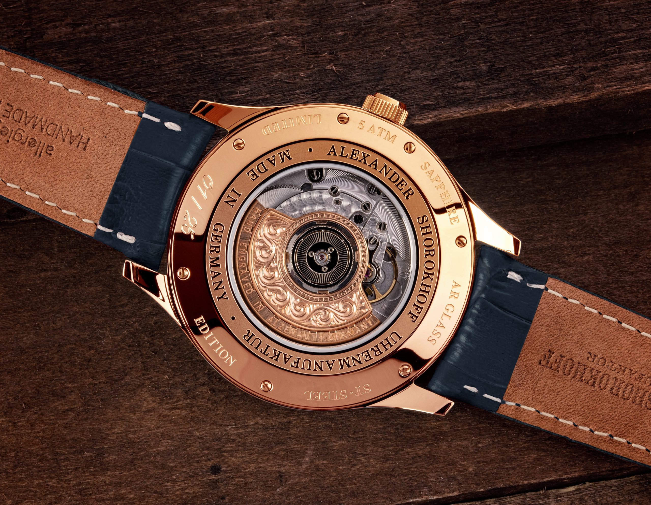 The movement is very complex consisting a lot of filigree elements enabling the hours to jump every full hour. This is why the manufacture is staking on the 100 years of experience of the company Dubois Depraz. The rotor is hand-engraved and additionally gold-plated and can be admired through the sapphire glass bottom.