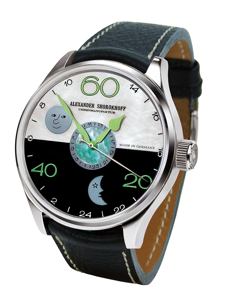 This delightful 24-hour watch “Day & Night” with a manual winding movement caliber 2423, is a real eye catcher – for two reasons: