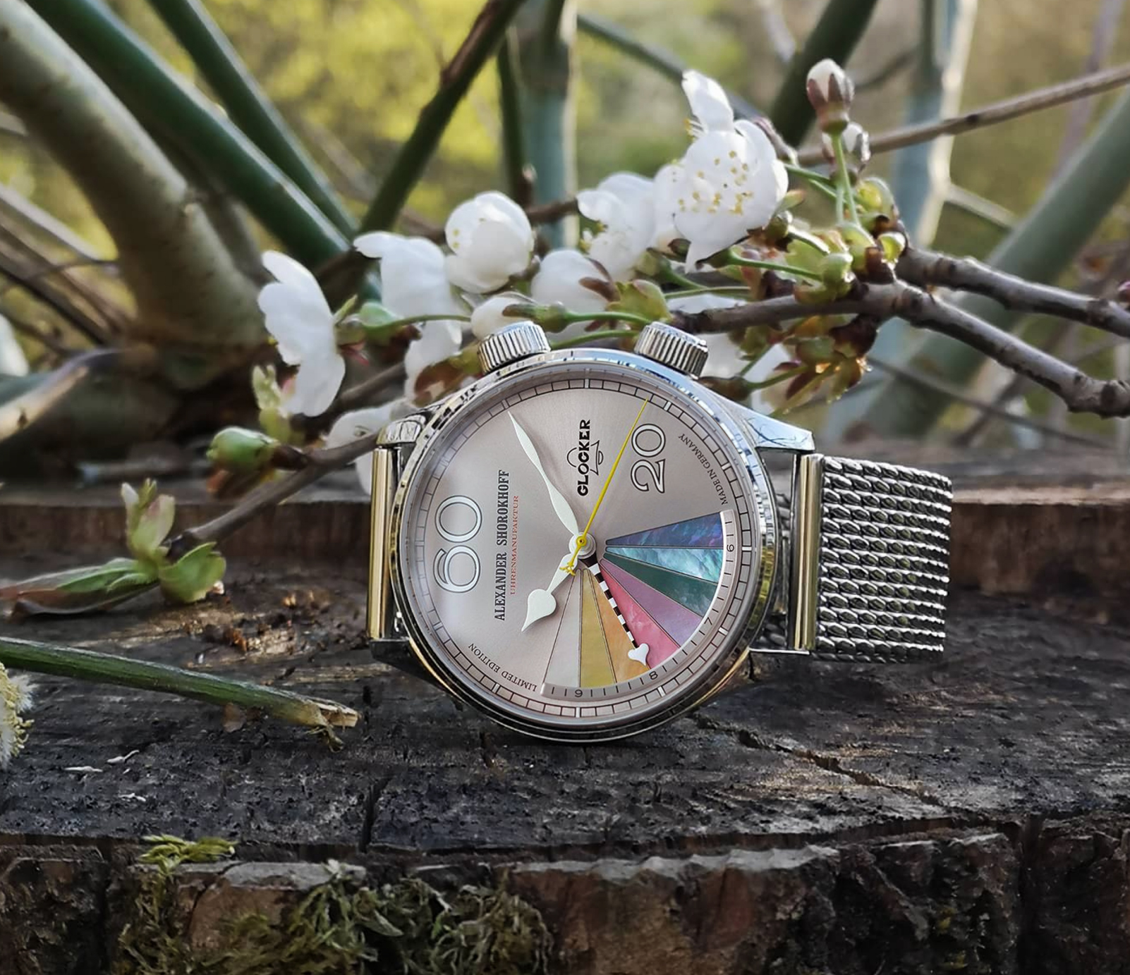 Eight mother-of-pearl sectors light up on a dark background and accompany the wearer during the first few hours of the day. If the hand is located at 5:30 am, it moves in the nightly dark blue. The colors change little by little, until the day finally starts around 9:30 am with a bright white mother-of pearl sector.