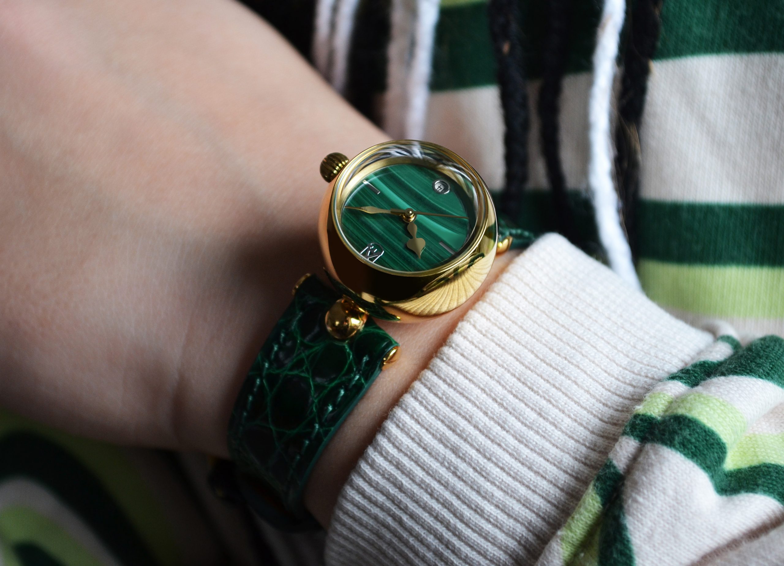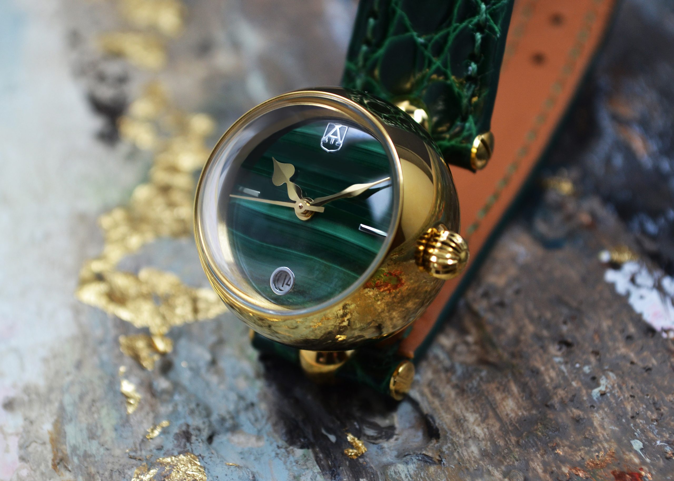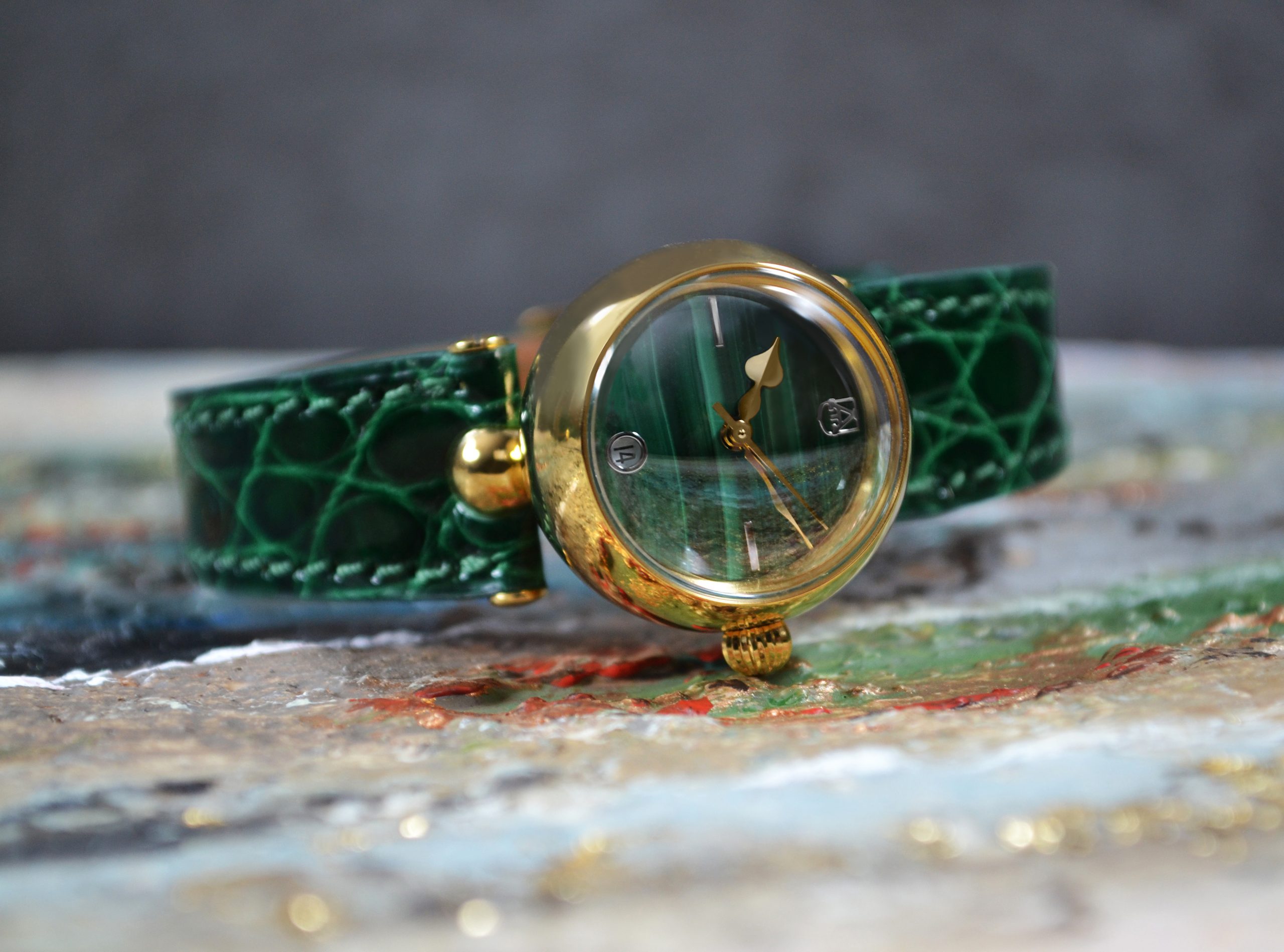 Inside the watch ticks the Swiss movement ETA.2671 with automatic winding. The rotor of the movement is hand-engraved. The genuine malachite dial highlights the gold and green color theme. Limited to only 30 pieces worldwide.