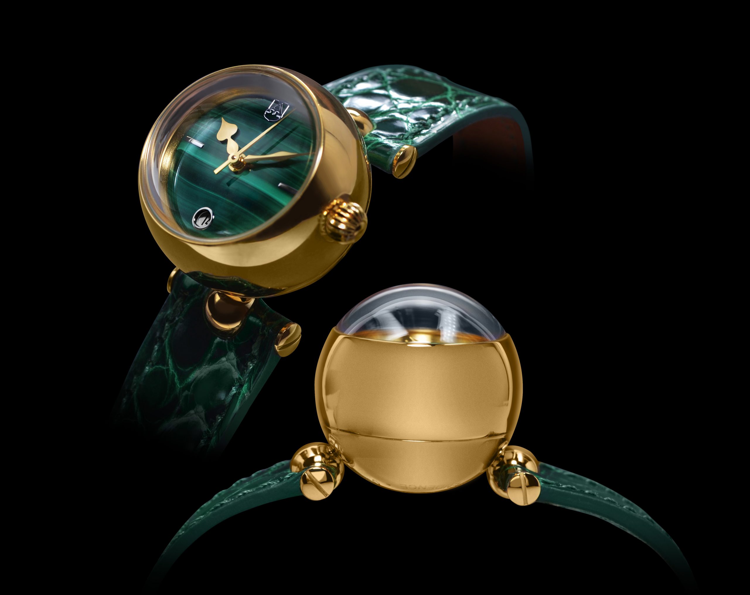 The spherical shape approaches perfection – without edges and corners, but also without beginning and end. The next successor to the new wristwatch “Shar”, which translated from Russian means “sphere”, shines in a shiny gold case.