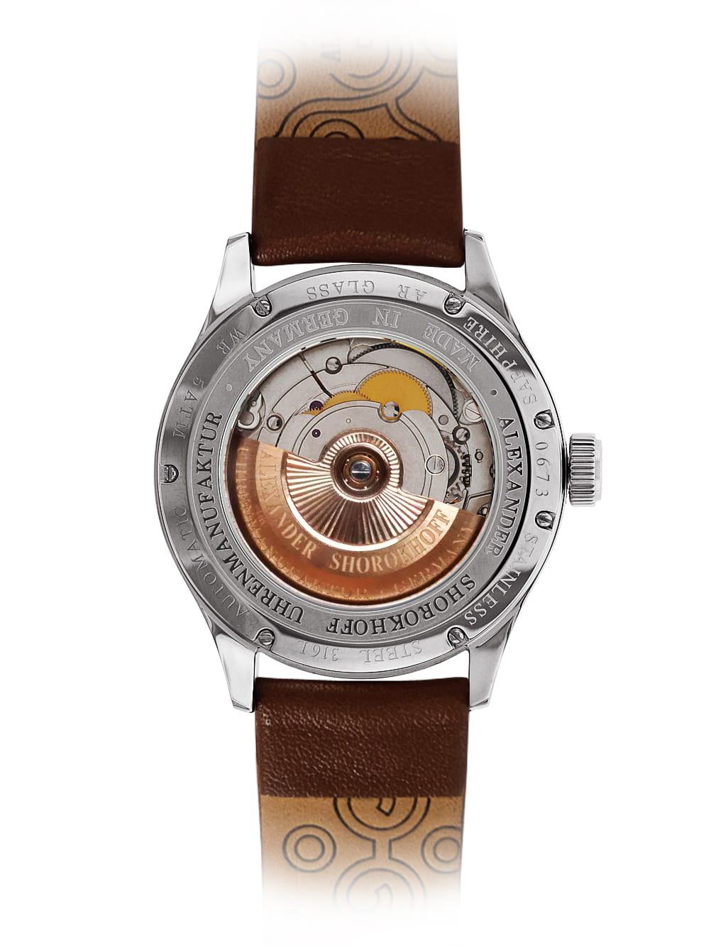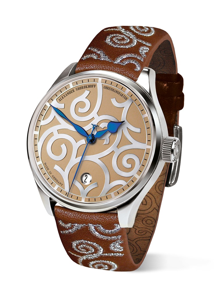The dial fascinates with its stylised and elaborate applied Arabic ornaments. Silver or black hour markers bring clarity and transparency to the design. The blued or white hands, the stainless steel case and the colour matching sting ray strap give classical elegance to this watch. The fine diamond powder on the ornamentation and the lurex embroidered leather strap underline the luxury appearance of the successor model.