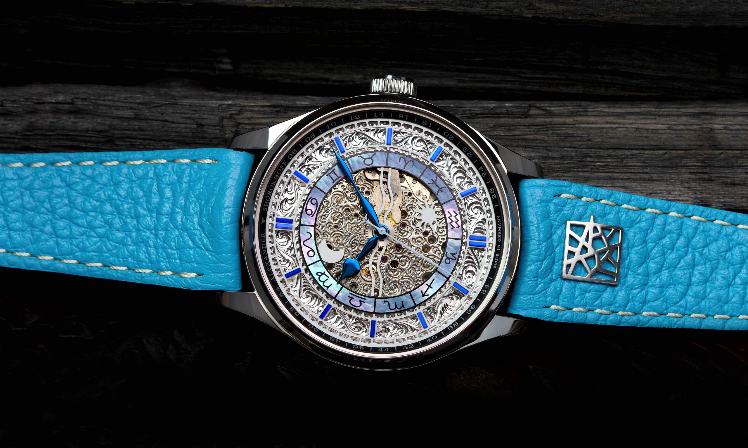 This is where the cultural fascination Babylonβs is picked up. In a highly complicated procedure, the movementβs plates and the outer ring of the dial are delicately carved out by hand and decoratively designed. The combination of the hour circle of dark blue mother-of-pearl with imprinted zodiac signs and blued hands and hour markers create a fascinating picture. On the back of the watch you can take pleasure in the masterful engravings.