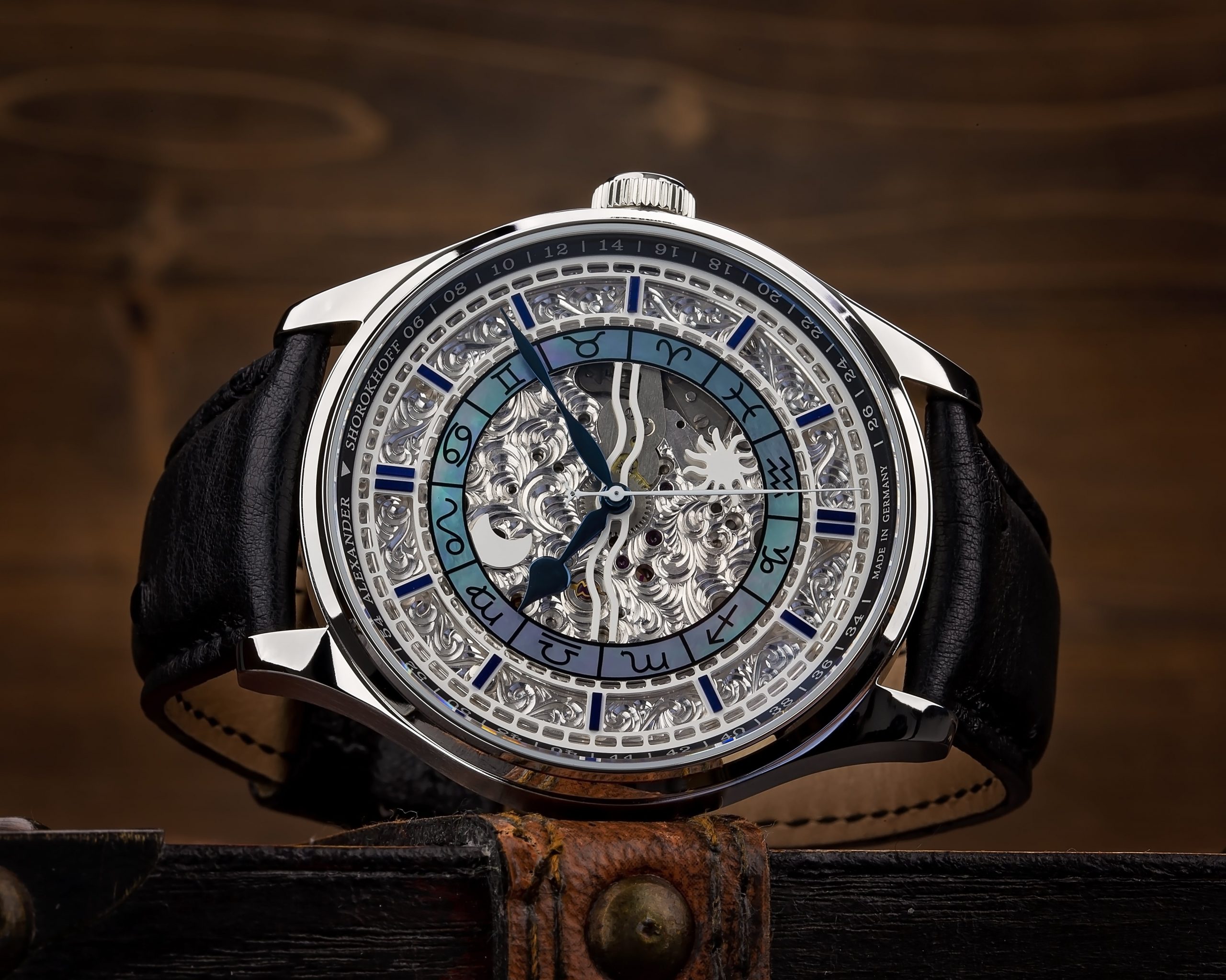 This is where the cultural fascination Babylon’s is picked up. In a highly complicated procedure, the movement’s plates and the outer ring of the dial are delicately carved out by hand and decoratively designed. The combination of the hour circle of dark blue mother-of-pearl with imprinted zodiac signs and blued hands and hour markers create a fascinating picture. On the back of the watch you can take pleasure in the masterful engravings.