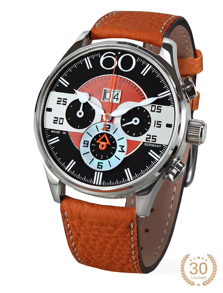 The mechanics of the β€œBig Date Chrono” necessitate a sophisticated movement to synchronize and accurately move the two digits. The Alexander Shorokhoff watch manufactory employs the reliable Swiss automatic chronograph movement Dubois-DΓ©praz DD4500. This movement offers exceptional precision, along with a stopwatch function and a luminous mother-of-pearl hour display at the 6 o’clock position. Additionally, it features a power reserve of 42 hours, complemented by a hand-engraved rotor.