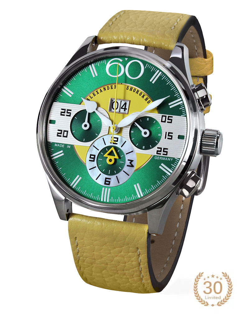 For the first time, Alexander Shorokhoff introduces a chronograph featuring a Big Date function, a distinctive date display innovation. The new model, β€œBig Date Chrono,” showcases the date through two separate, larger digits positioned directly at the 12 o’clock mark.