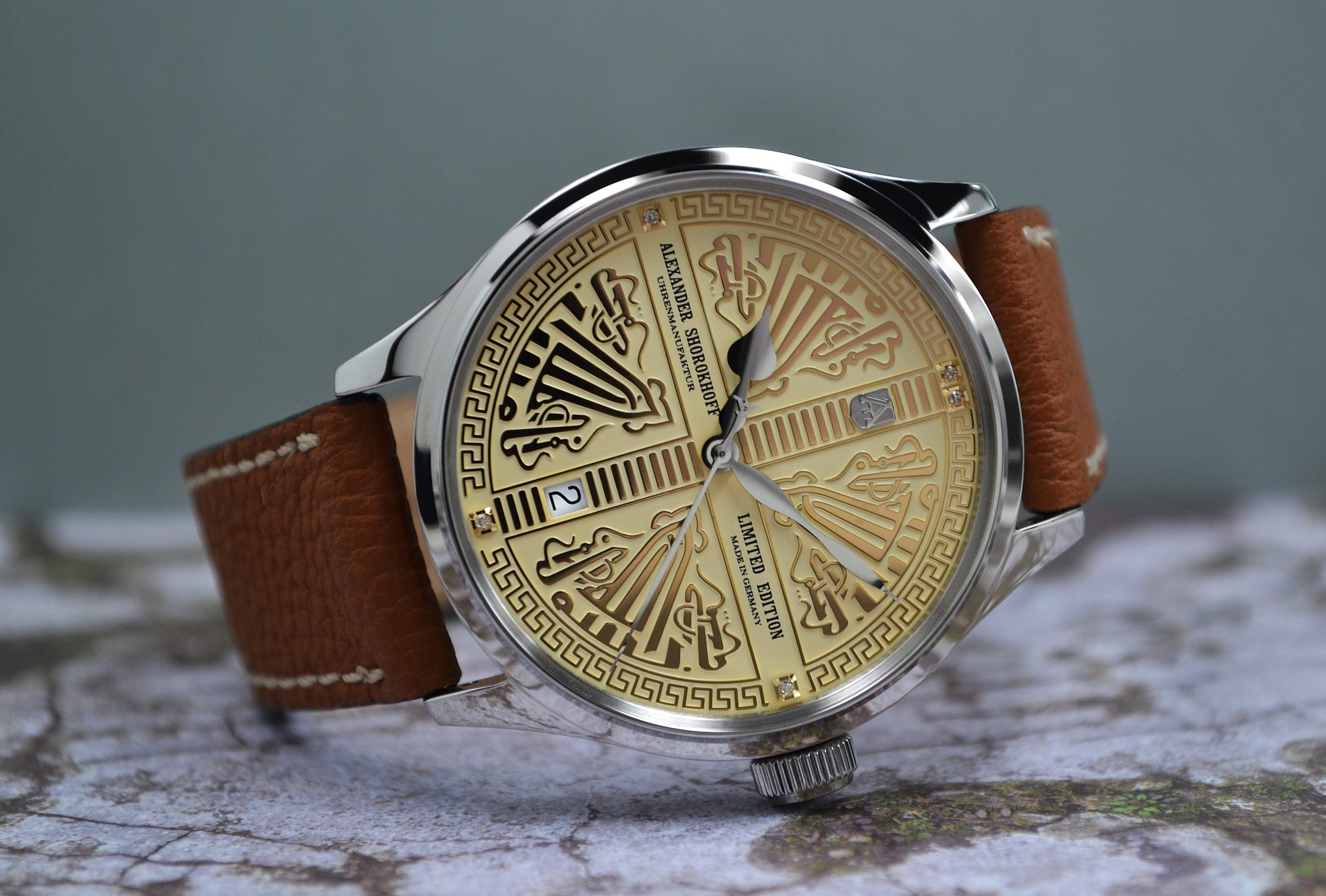 The ornaments gathered from Arabic calligraphy present themselves in a new interpretation. The dial is divided into four sectors, surrounded by a meander – a motif from the art of ancient Greece. In the center there is a cross, which recalls the earlier Christian history of this modern metropolis.
