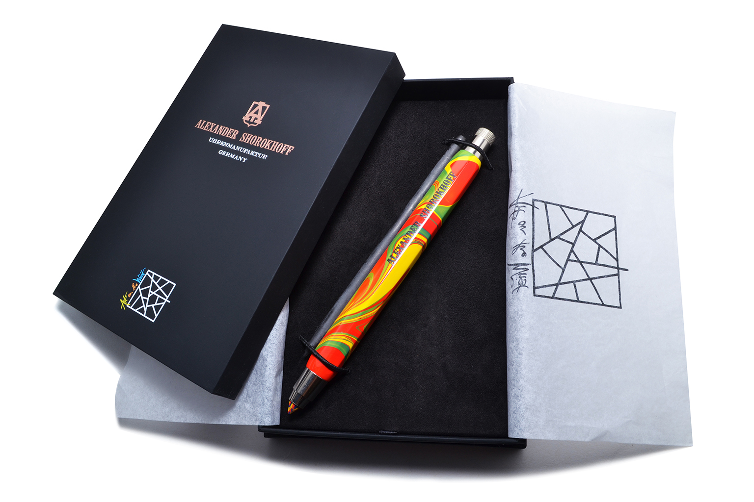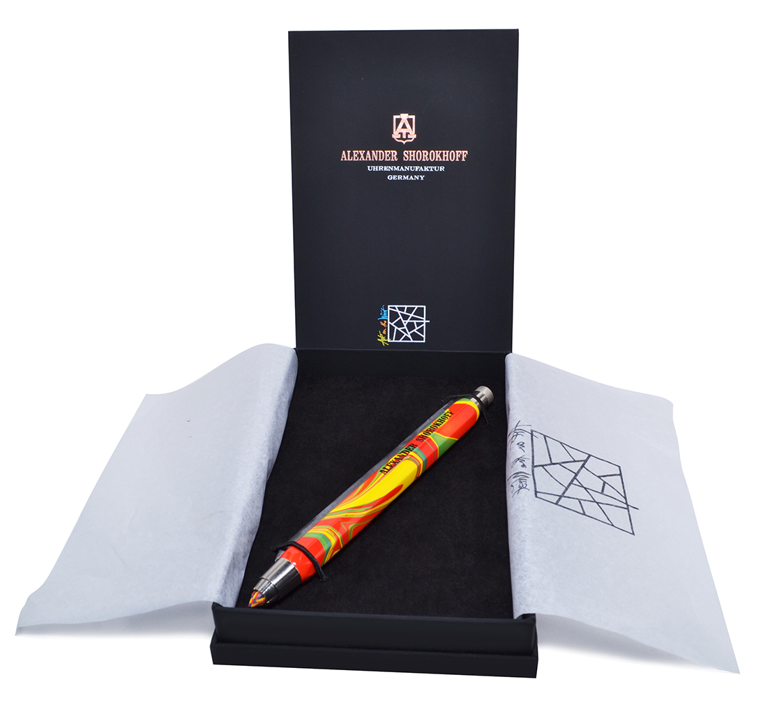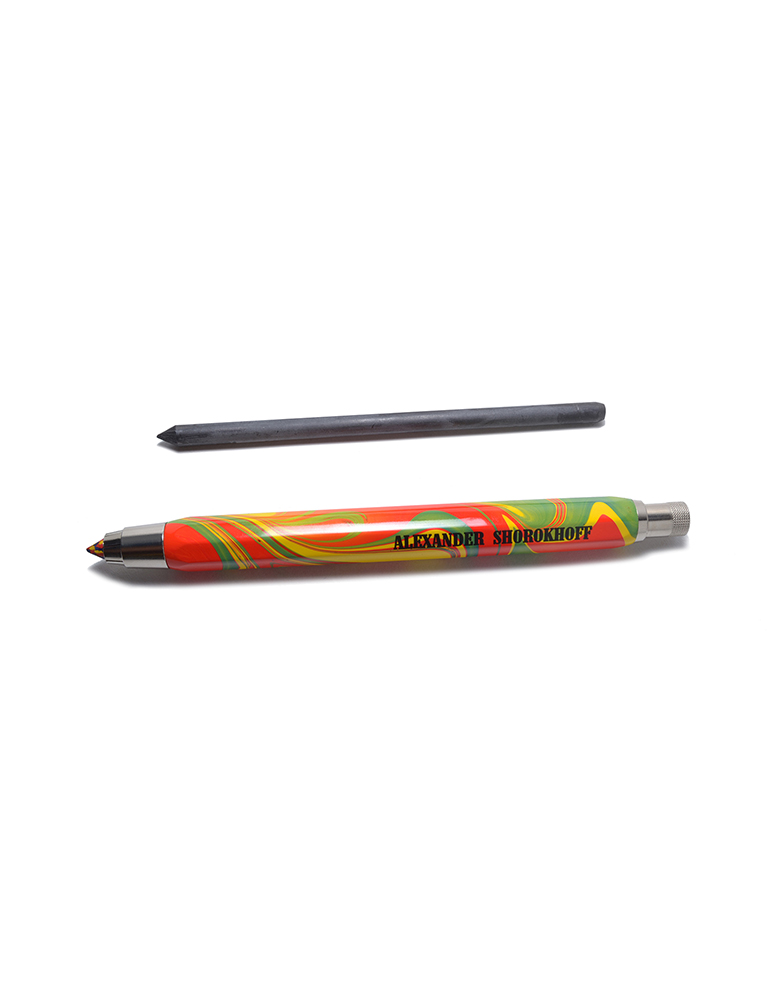 Metal mechanical pencil, with a high-quality mechanism, with integrated sharpener in the unscrewable push button, colorful lacquered with Alexander Shorokhoff logo.