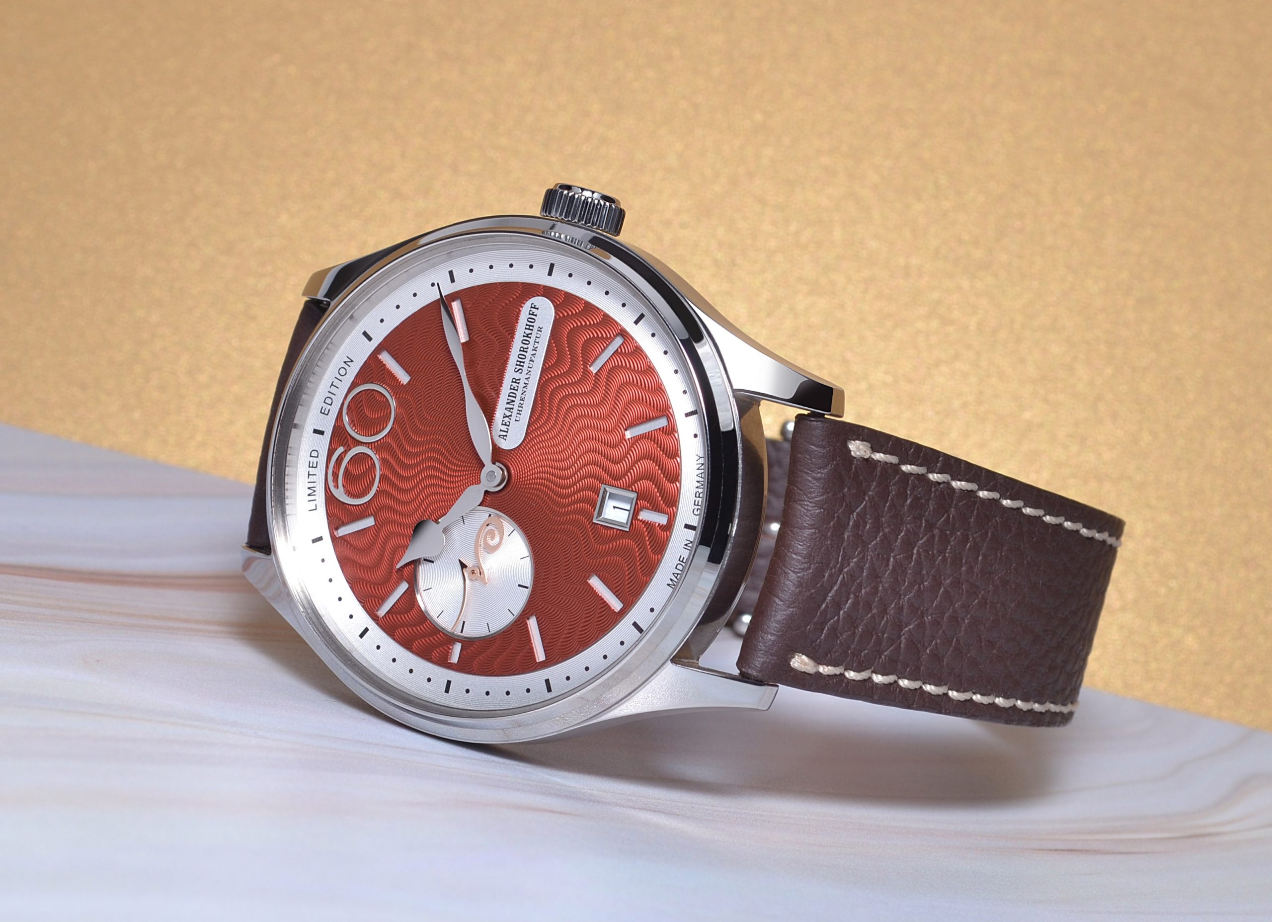 For the movement, the Russian caliber 3105.Poljot is used, which is derived from the Swiss Valjoux caliber 7734, but without chronograph function. The movement is completely overhauled, re-oiled, adjusted and tested at the β€œAlexander Shorokhoff” watch manufacture. The bridges, as always with β€œAlexander Shorokhoff” brand watches, are hand-engraved or cloud-cut, and the screws are polished and blued. This beauty can be viewed through the sapphire crystal bath. These movements are no longer reproduced today. However, the β€œAlexander Shorokhoff” watch manufactory has secured a limited quantity and produces this series in a small limited edition.