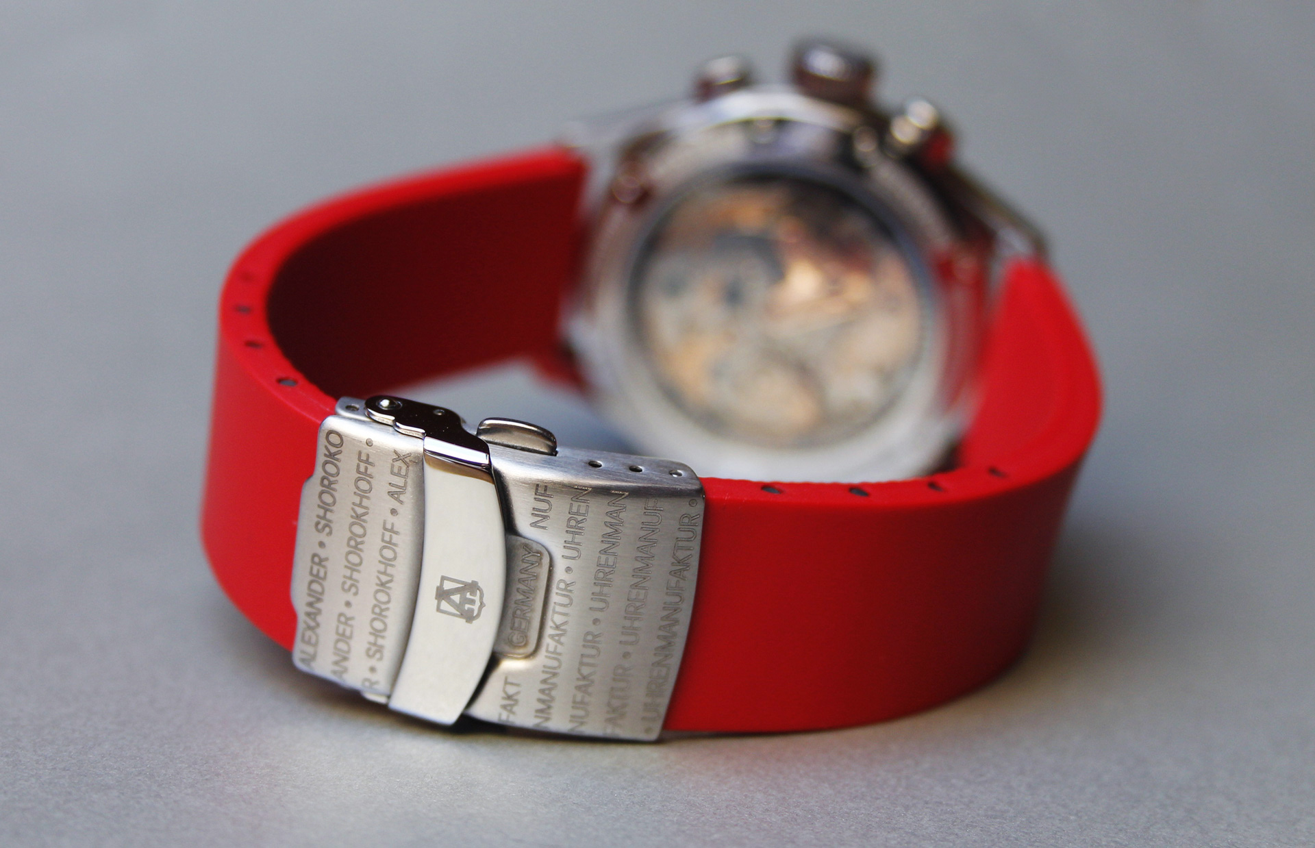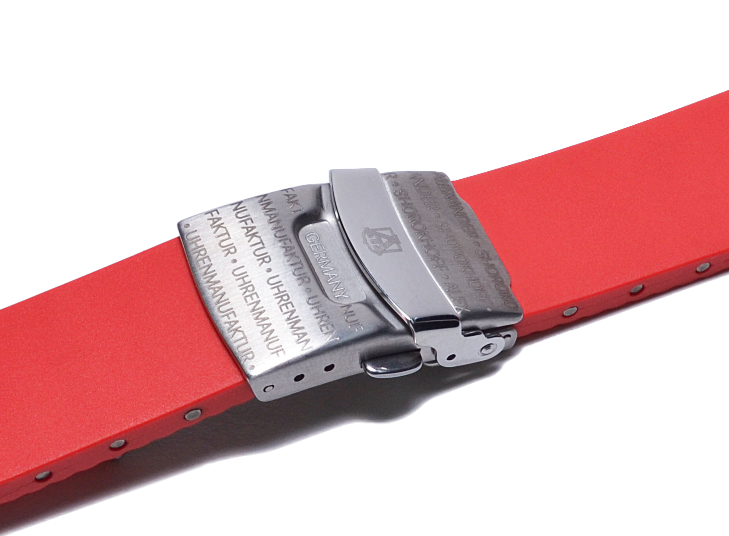Genuine rubber strap in red with lasered logo “Art on the Wrist”, 20 mm wide, length can be adjusted.