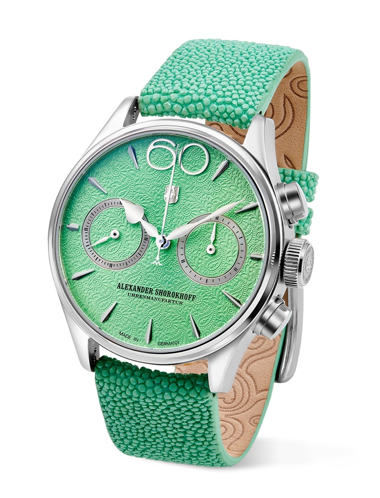 Alexander Shorokhov wanted to design the model β€œSpring” in very fresh colors. Light green shades play the main role, just like the first buds and leaves that begin to sprout and come to life. But this model was not only to be colorful, but also decorative. Therefore a special dial pattern in paisley look was worked out and reshaped, which fully corresponds to the first spring feelings.