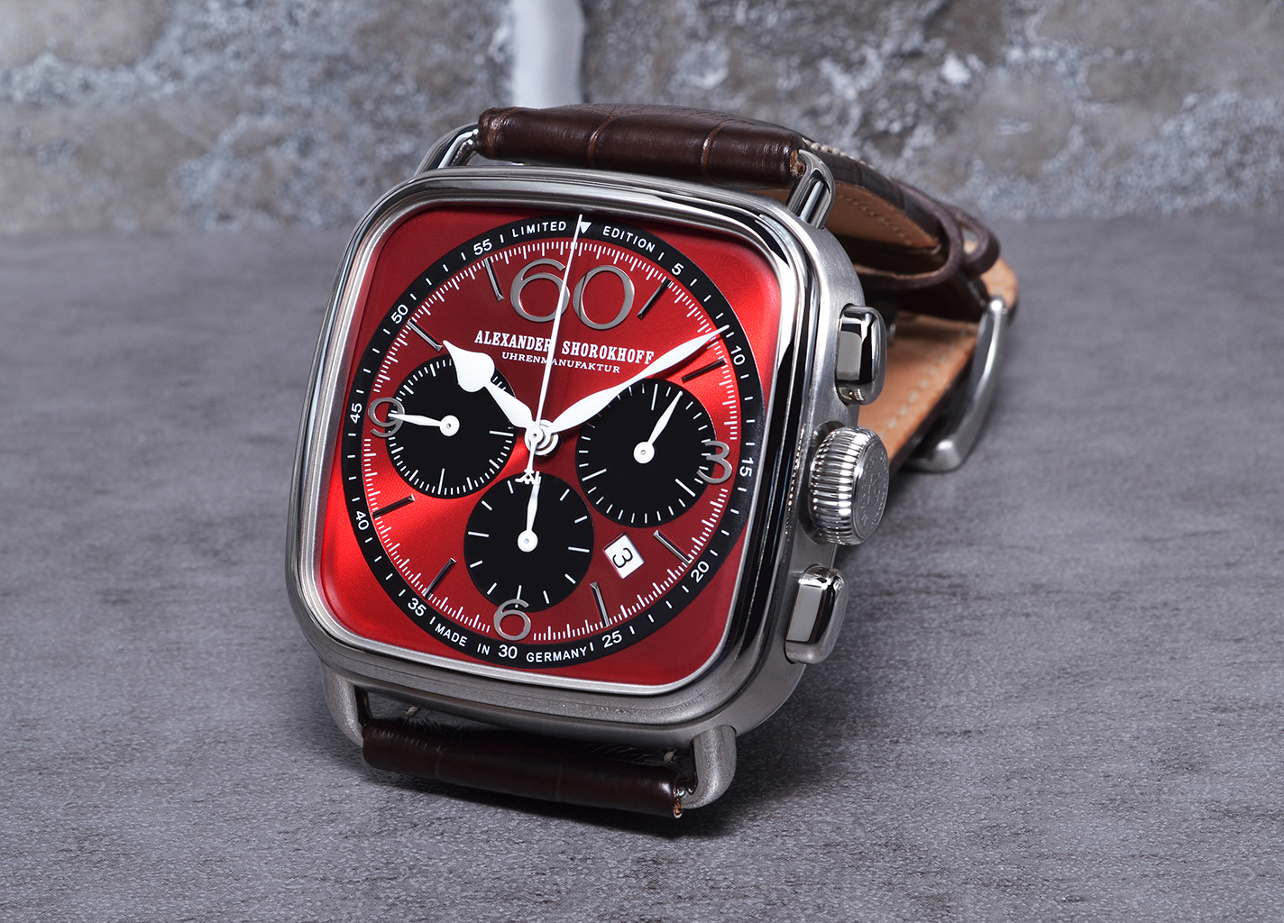 In the new chronograph he plays with exactly these different colors, shapes and contrasts. The colors are clearly the main feature of the new series. For the red, a darker and stronger but still warm shade was chosen, black remains down-to-earth and serious and is realized in a semi-matte finish. The matching contrasting colors for the models are black and white. This not only creates a contrast in terms of color, but also emotionally. In this case, the contrasting shades of warm and cold are not contrary, but harmonize with each other and complement each other.