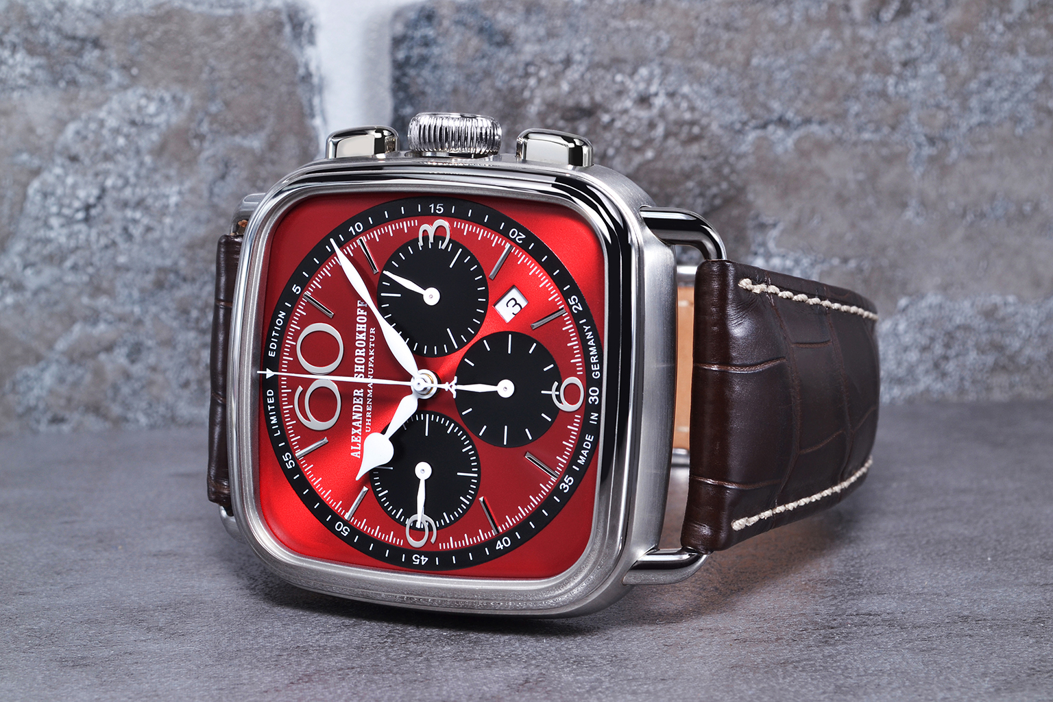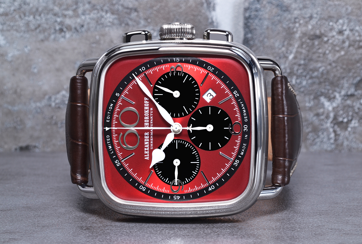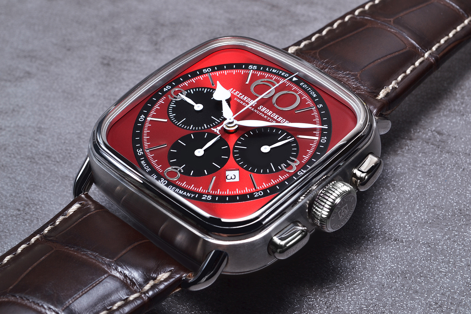 Dial: Red with black sub-dials and black scale, with silver-colored appliquΓ©s