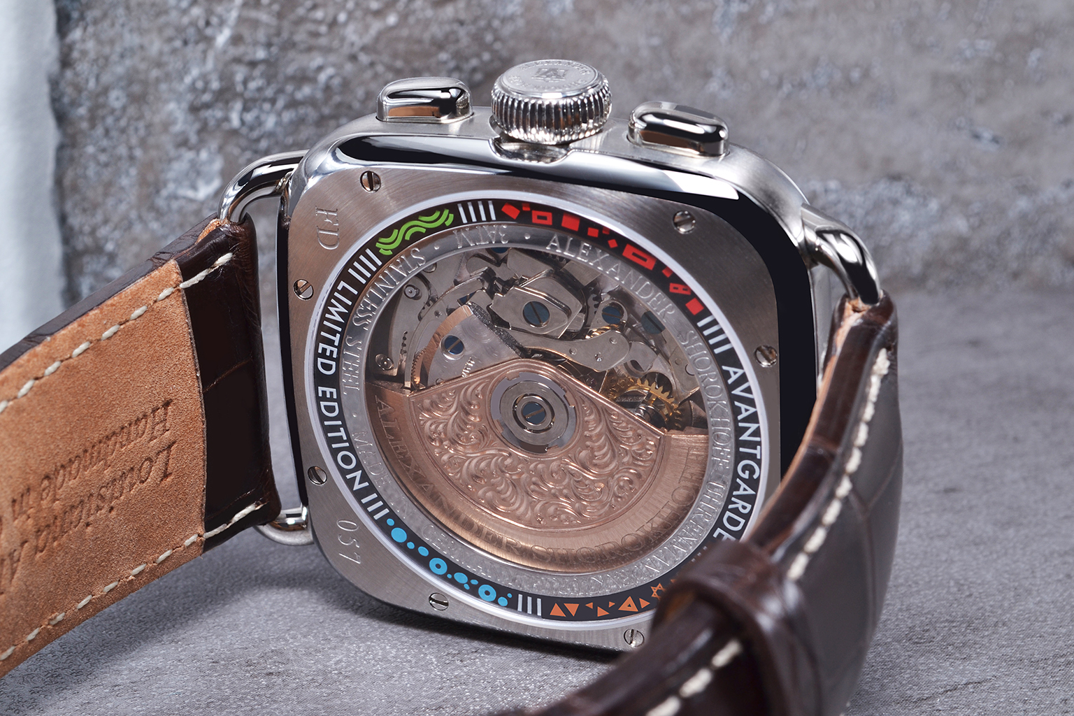 This color combination is produced with an automatic movement ETA 7753, which is elaborately revised, hand-engraved and refined at the β€œAlexander Shorokhoff” watch manufacture. The small technical wonder can be seen through the sapphire crystal caseback. Furthermore, there is also an avant-garde ring on the back, which emphasizes the affiliation to the β€œAvantgarde” collection.