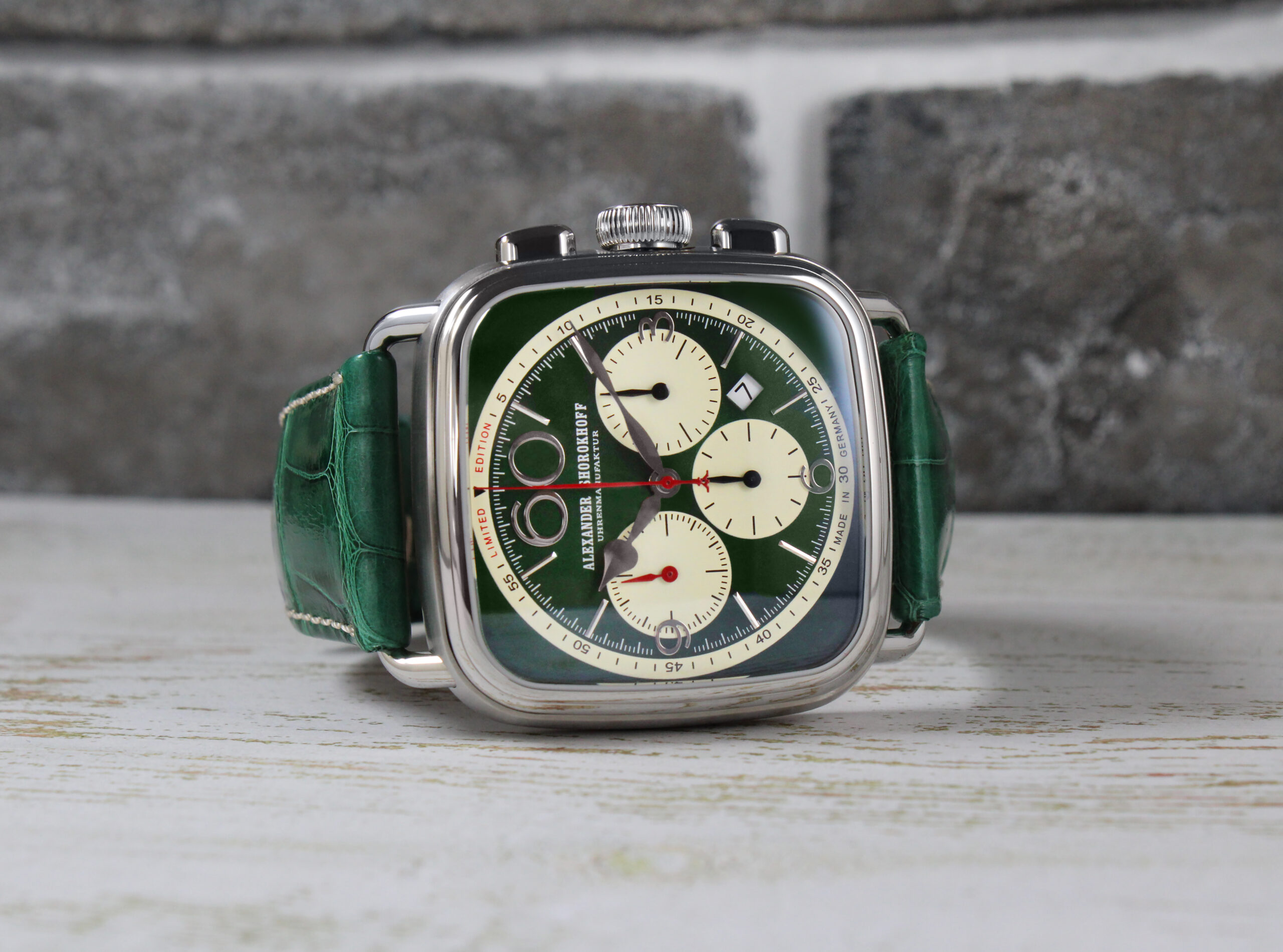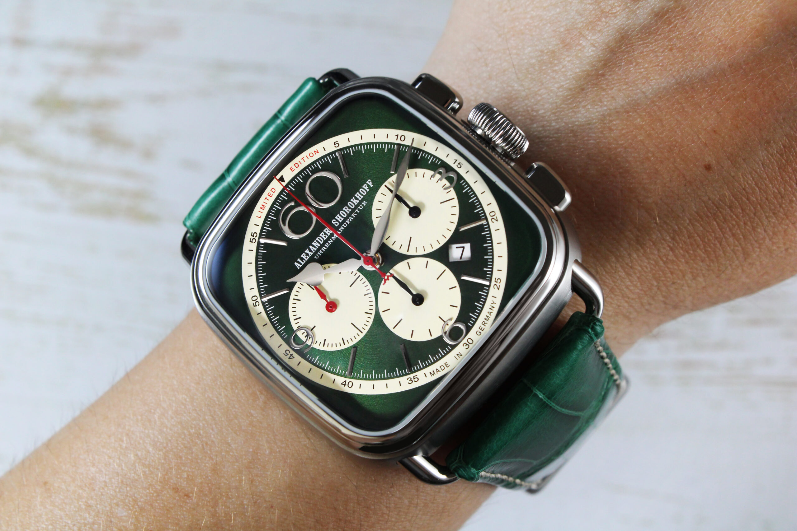 In the new β€œSquare & Round” chronograph in green, Alexander Shorokhoff deliberately combines contrasts, colors, and clear geometry to create a distinctive overall look. The rich green of the dial has a special depth and vibrancyβ€”combined with cream-colored totalizers, silver-colored appliquΓ©s, and clear lines, it creates a play of warmth and clarity. The subtle contrasts are not only visually exciting, but also give the watch an emotional balance – expressive, modern, and timeless at the same time.